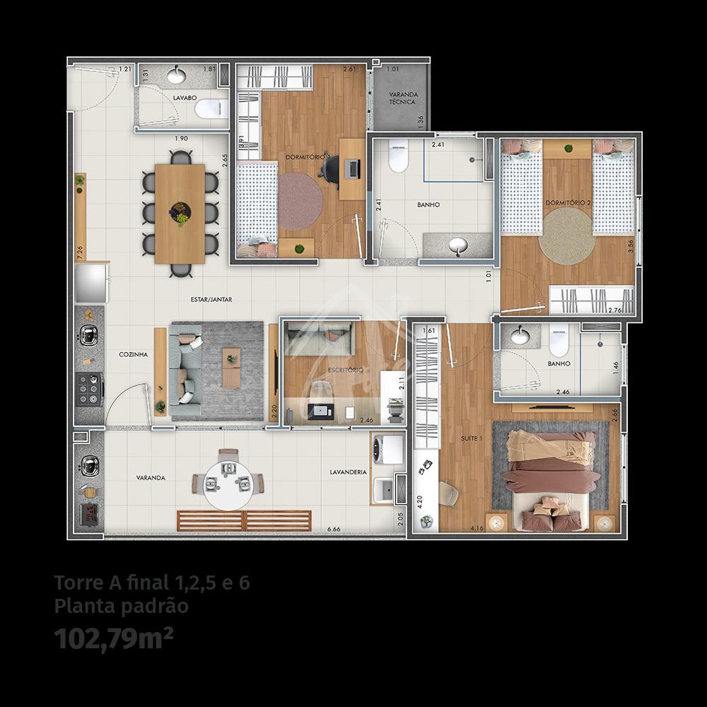 - 102m² com 4 dormitórios sendo 1 suíte (possibilidade de remover 1 dos dormitórios e ampliar com a sala: